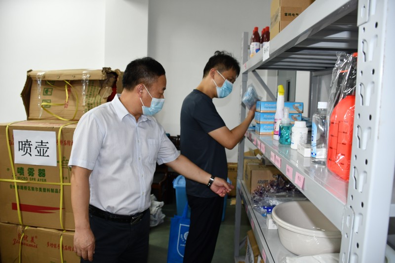 孔组长一行在学校副校长耿兴华的陪同下,实地查看了学校疫情防控工作,现场调研了学校疫情防控物资仓库,翻阅了《江苏省无锡交通高等职业技术学校新型冠状病毒感染的肺炎疫情防控工作方案》《学校疫情防控期间校园通风消毒及卫生工作实施方案的通知》等文件和制度。
