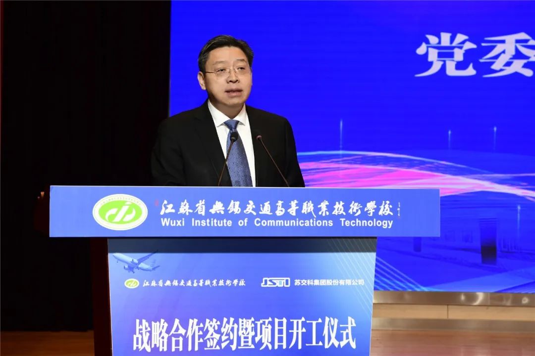 江苏省交通运输厅副厅长金凌出席会议并讲话。江苏联合职业技术学院党委书记夏成满,无锡市交通运输局党委书记、局长俞刚,无锡市教育局副局长惠恭健,无锡交通产业集团有限公司总裁许青凯,无锡地铁集团有限公司副总工程师衡瑜,苏交科集团股份有限公司总裁朱晓宁,江苏省无锡交通高等职业技术学校党委书记、校长李虎,江苏省交通运输厅政治处副处级干部季仕锋,苏交科集团股份有限公司副总裁计月华,苏交科集团股份有限公司副总裁王卫等领导出席会议并见证仪式。会议由学校党委委员、副校长耿兴华主持。