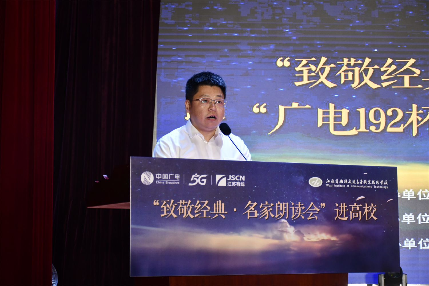 6月5日下午,一场别开生面的文化盛宴在学校大礼堂拉开帷幕。由江苏有线无锡分公司主办,无锡市学生联合会、江苏省无锡交通高等职业技术学校联合承办的“致敬经典·名家朗读会”进高校暨“广电192杯”创意短视频大赛启动活动在此成功举办。无锡市委宣传部出版印刷发行处副处长冯健,共青团无锡市委学少部副部长王裔,江苏有线无锡分公司党委委员、副总经理赵晓光,校党委委员、副校长耿兴华、王珏及在锡高校领导代表、江苏有线无锡分公司代表、我校师生代表600余人共同参加了本次活动。