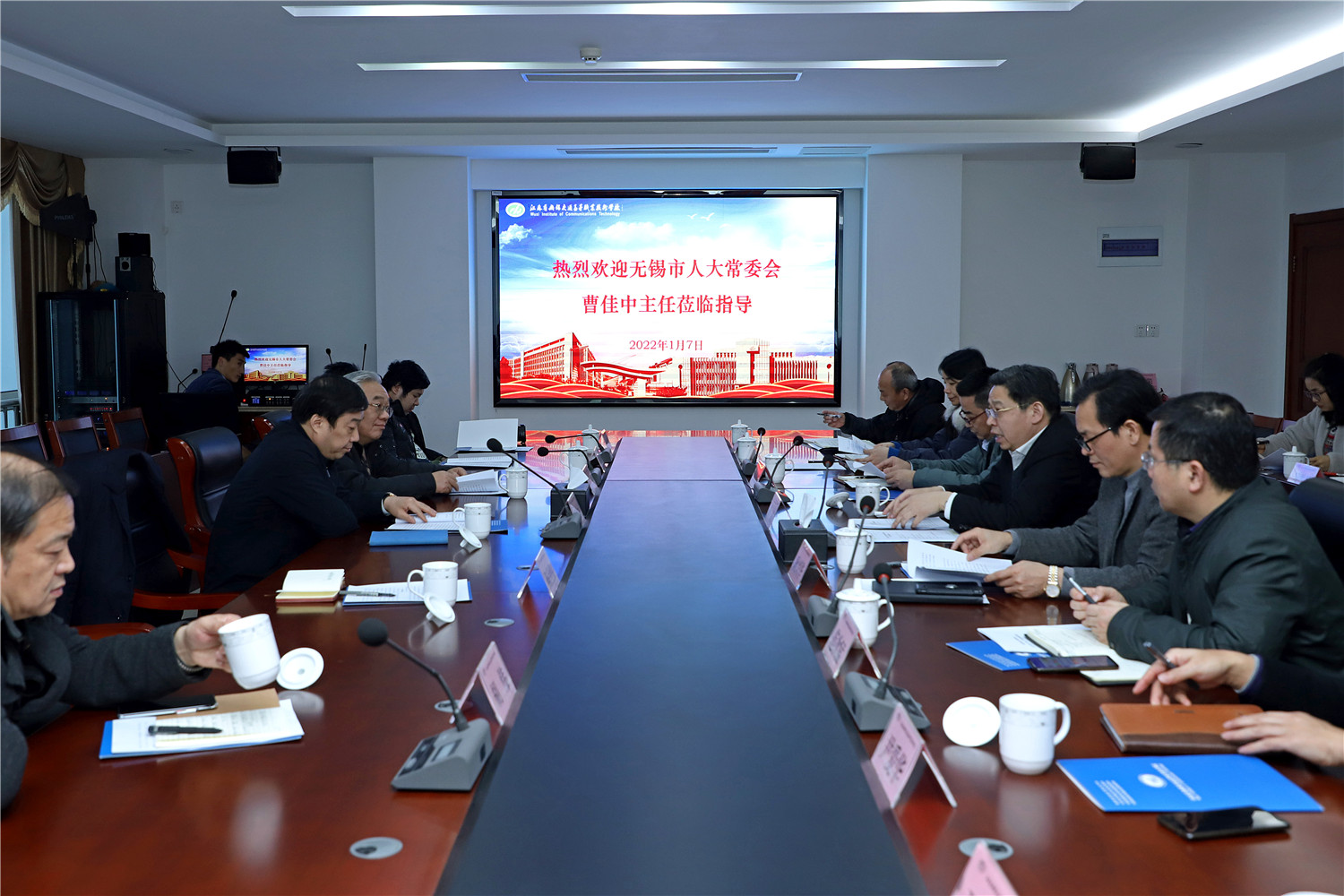 1月7日,无锡市人大常委会副主任、市综合交通运输学会理事长曹佳中,无锡市综合交通运输学会常务副理事长薛军一行莅临学校视察调研,学校党委书记、校长李虎,学校党委委员、副校长耿兴华、倪依纯陪同视察调研活动。