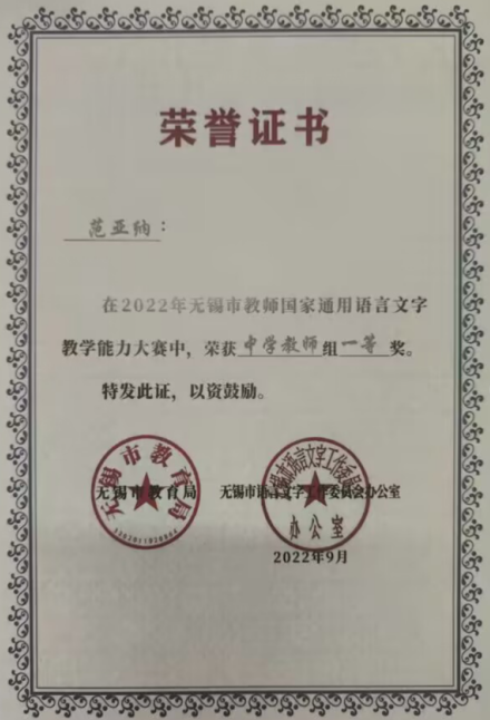 近日,基础教学部范亚纳老师在“2022年无锡市教师国家通用语言文字教学能力大赛”中,荣获中学教师组一等奖!