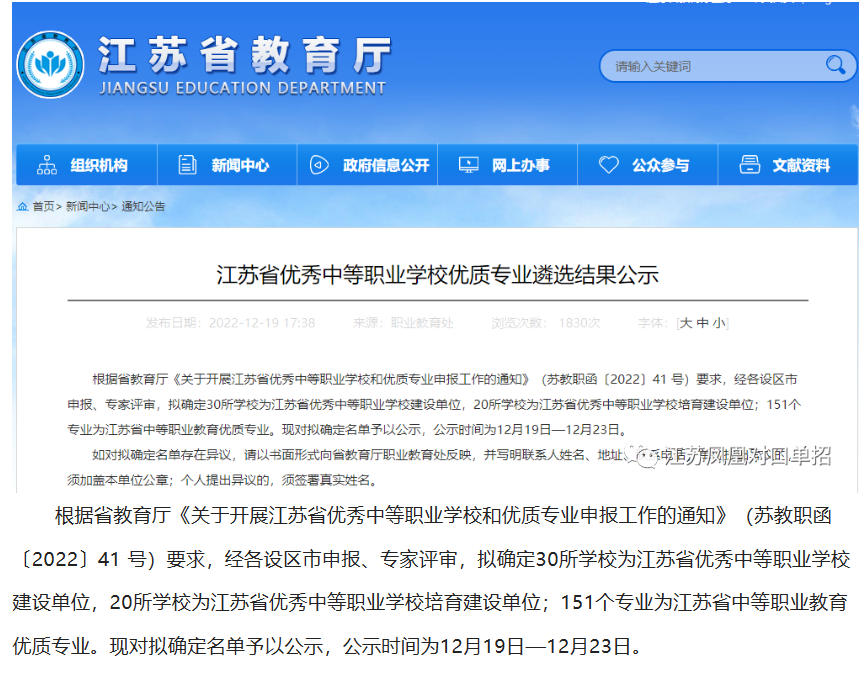近日,在省教育厅公布的《关于开展江苏省优秀中等职业学校和优质专业申报工作的通知》(苏教职函〔2022〕41 号)中,经各设区市申报、专家评审,拟确定151个专业为江苏省中等职业教育优质专业。学校船舶工程技术和道路与桥梁工程技术两个专业被认定为省优质专业。