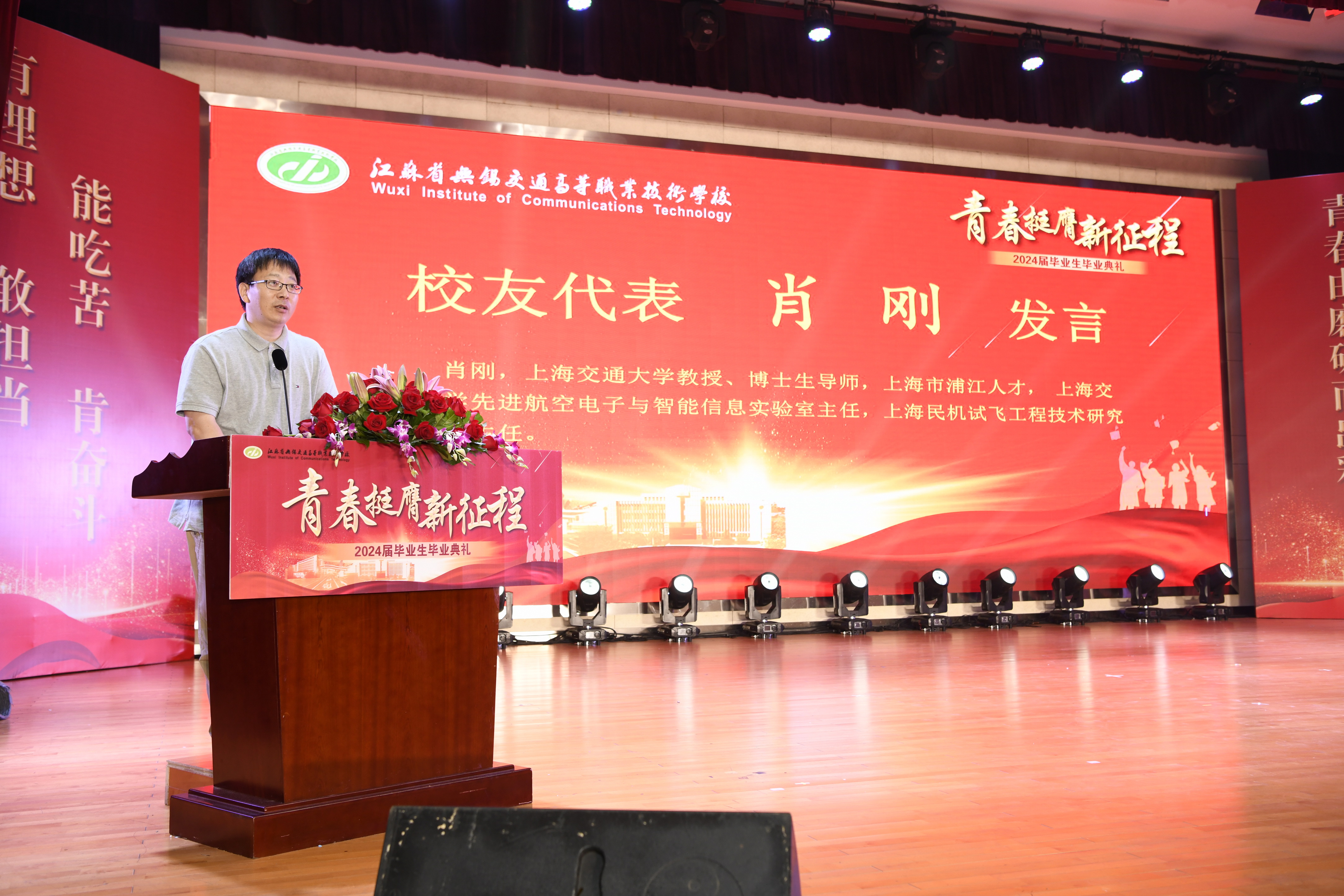 上海交通大学博士生导师肖刚教授作为校友代表发言,他勉励同学们要有感恩之心、责任之心、知学之心,投身交通强国建设之中,用奋斗的青春书写人生新篇章。无锡市石油化工设备有限公司党支部书记、质量安全总监柳博作为合作企业代表,向毕业生分享了三点成长体会:爱学习、爱工作、爱自己和家长,祝愿同学们在未来的青春岁月里心想事成,大有作为。