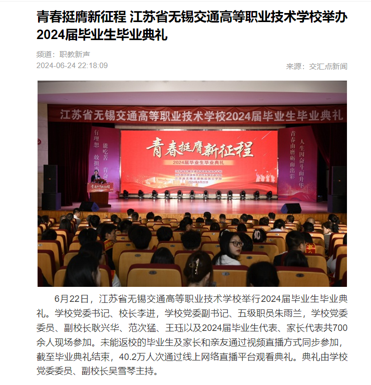 交汇点:青春挺膺新征程 江苏省无锡交通高等职业技术学校举办2024届毕业生毕业典礼