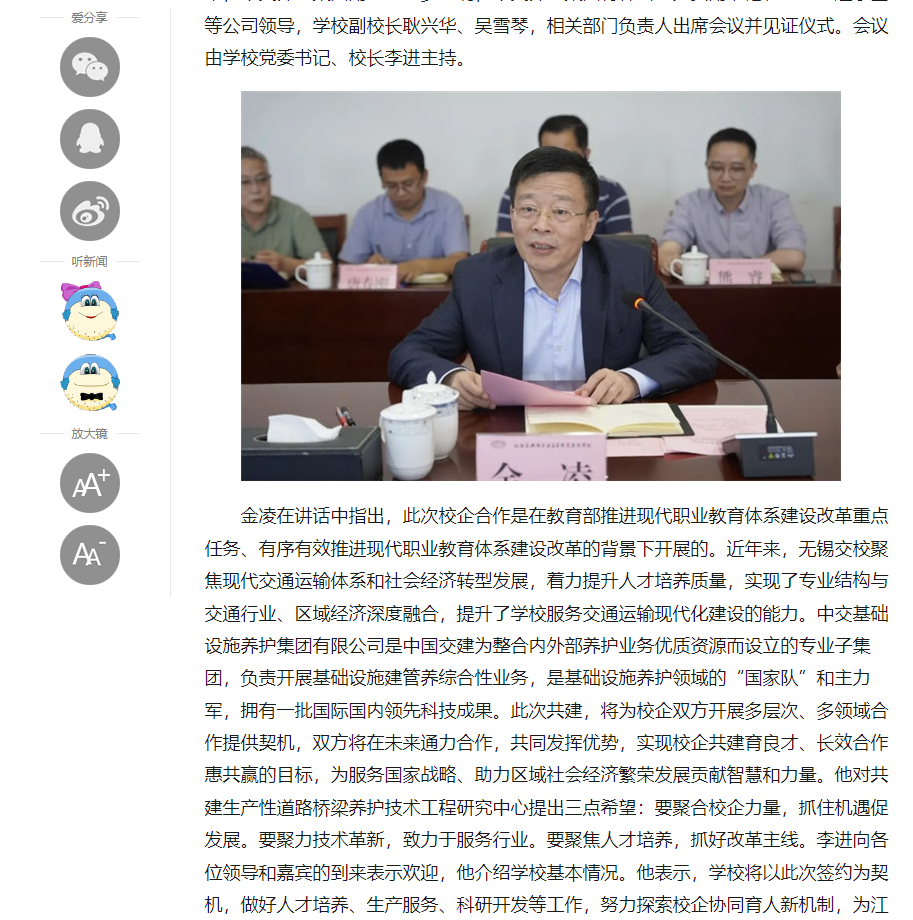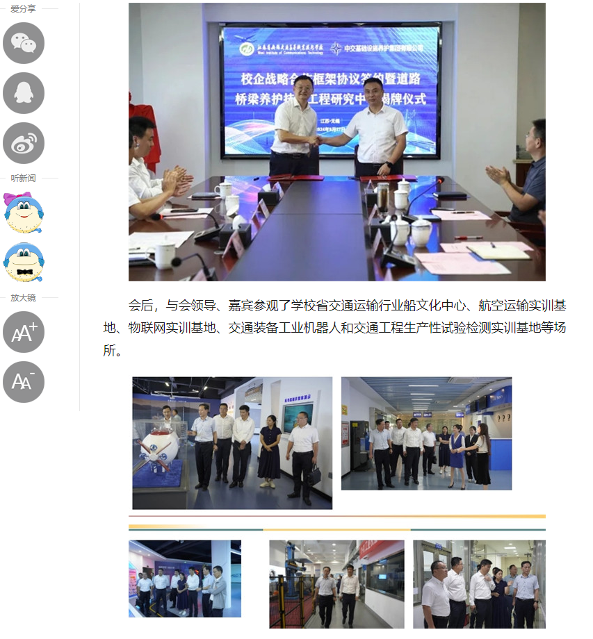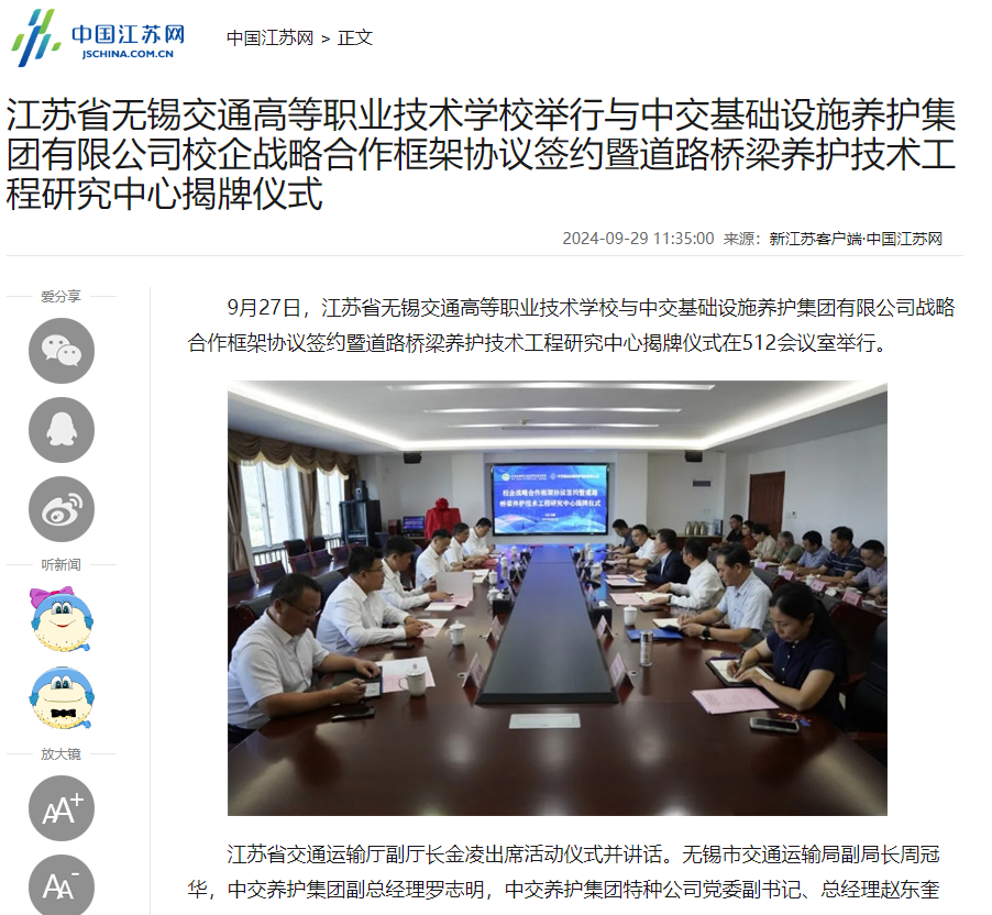 中江网:江苏省无锡交通高等职业技术学校举行与中交基础设施养护集团有限公司校企战略合作框架协议签约暨道路桥梁养护技术工程研究中心揭牌仪式