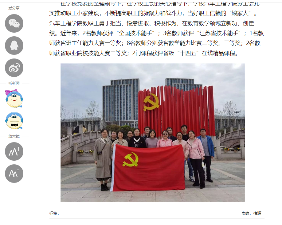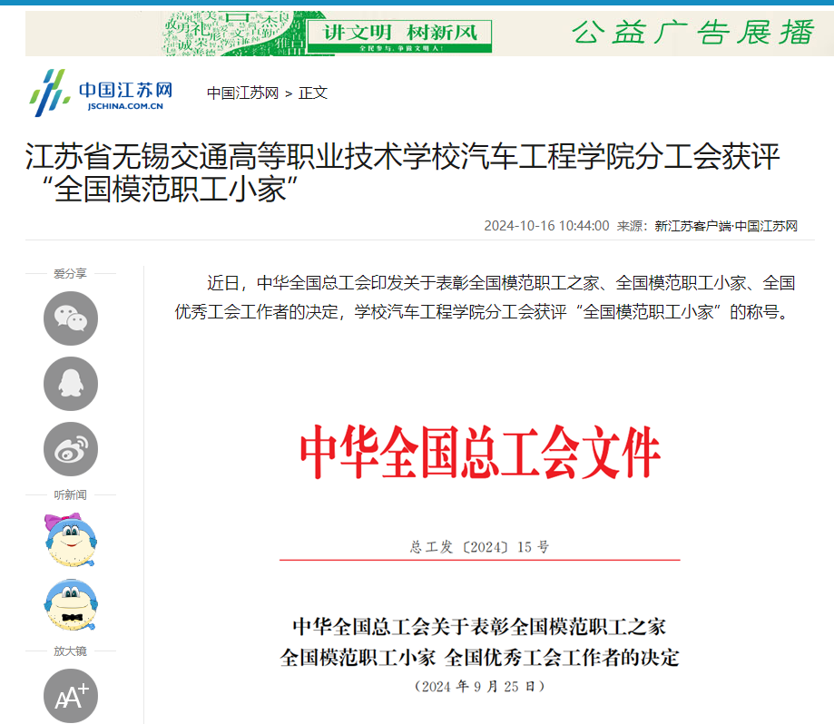 中江网:江苏省无锡交通高等职业技术学校汽车工程学院分工会获评“全国模范职工小家”