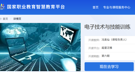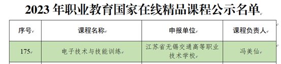 近日,教育部公示了2023年职业教育国家在线精品课程认定结果,我校冯美仙老师主持的《电子技术与技能训练》课程成功入选并上线国家职业教育智慧教育平台,实现我校国家在线精品课程零的突破。