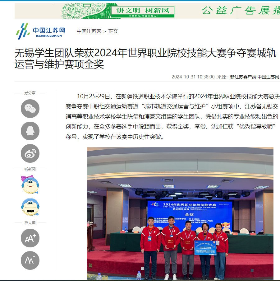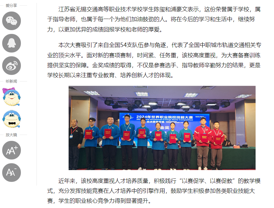学习强国江苏学习平台:无锡学生团队荣获2024年世界职业院校技能大赛争夺赛城轨运营与维护赛项金奖