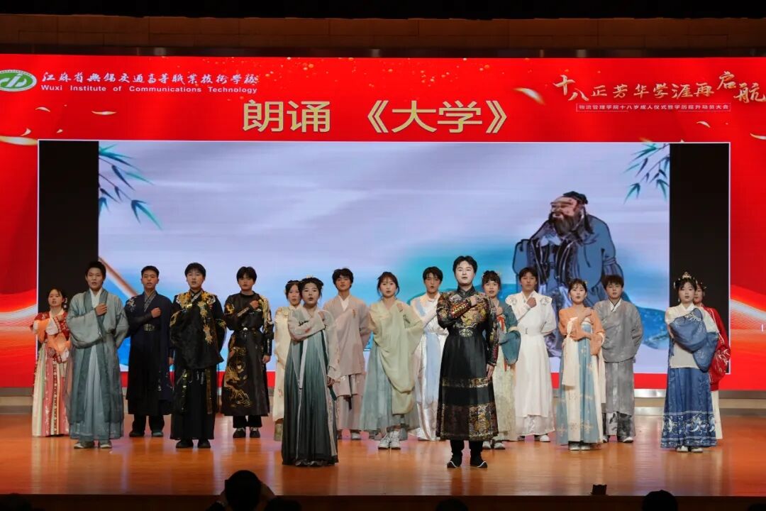 活动在暖场视频中拉开序幕,一幕幕优秀学子的成长画面,展现了学子从青涩到成熟的蜕变历程。学生代表221711班王依婷以“十八岁的责任与理想”为题发言,她动情回顾校园时光,呼吁同龄人“以奋斗为底色,用知识武装自我,扛起家国责任”。诗朗诵《大学》节选以古韵今声诠释“修身齐家治国”的深远内涵,赢得全场掌声。家长代表吴义平先生则以质朴语言传递殷切期望:“愿你们永葆赤子之心,脚踏实地追逐梦想。”