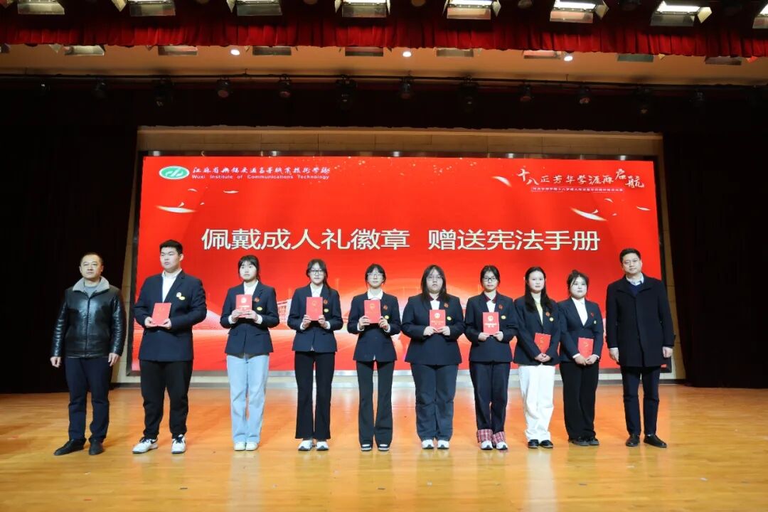 盛姣老师从职业教育使命出发,勉励学生“把握学历提升机遇,在技能报国之路上行稳致远”。校友代表薛子骏结合自身成长经历,分享“终身学习”的重要性,引发共鸣。傣族舞《喜水》以灵动舞姿为仪式注入青春活力,彰显多元校园文化。 在庄重的成人礼环节,教务处、学生工作处教师为学子佩戴成人礼徽章并赠送宪法手册,象征法律赋予的权利与义务。张龙枝老师带领全体学生面向国旗宣誓,誓言铮铮,回荡礼堂。