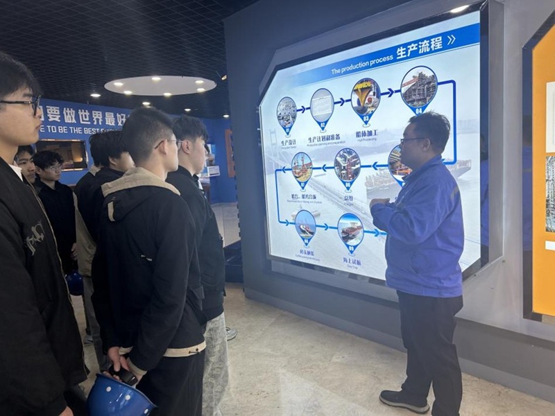 在企业专家的带领下,我校师生首先参观了厂区船坞、船台及各个车间,直观学习到了各个船舶分段,并了解目前企业主要在建船型,使学生深刻学习到了造船流程。随后,学生们登上了一艘5万吨成品油船,参观了机舱、甲板、驾驶台等区域。企业专家非常细致地给学生讲解了主机、发电机、锅炉、制冷装置、轴系等重要的机舱设备,并介绍了部分技术非常先进的新设备,让学生学习到了很多在课堂中难以获取的新知识,拓宽了专业知识面。最后,企业专家为我校师生介绍了扬子江集团的乐鱼·体育、已建造的典型船舶、企业发展愿景等。企业方表示,后续将进一步加强和我校的合作,共育高素质船业人才。