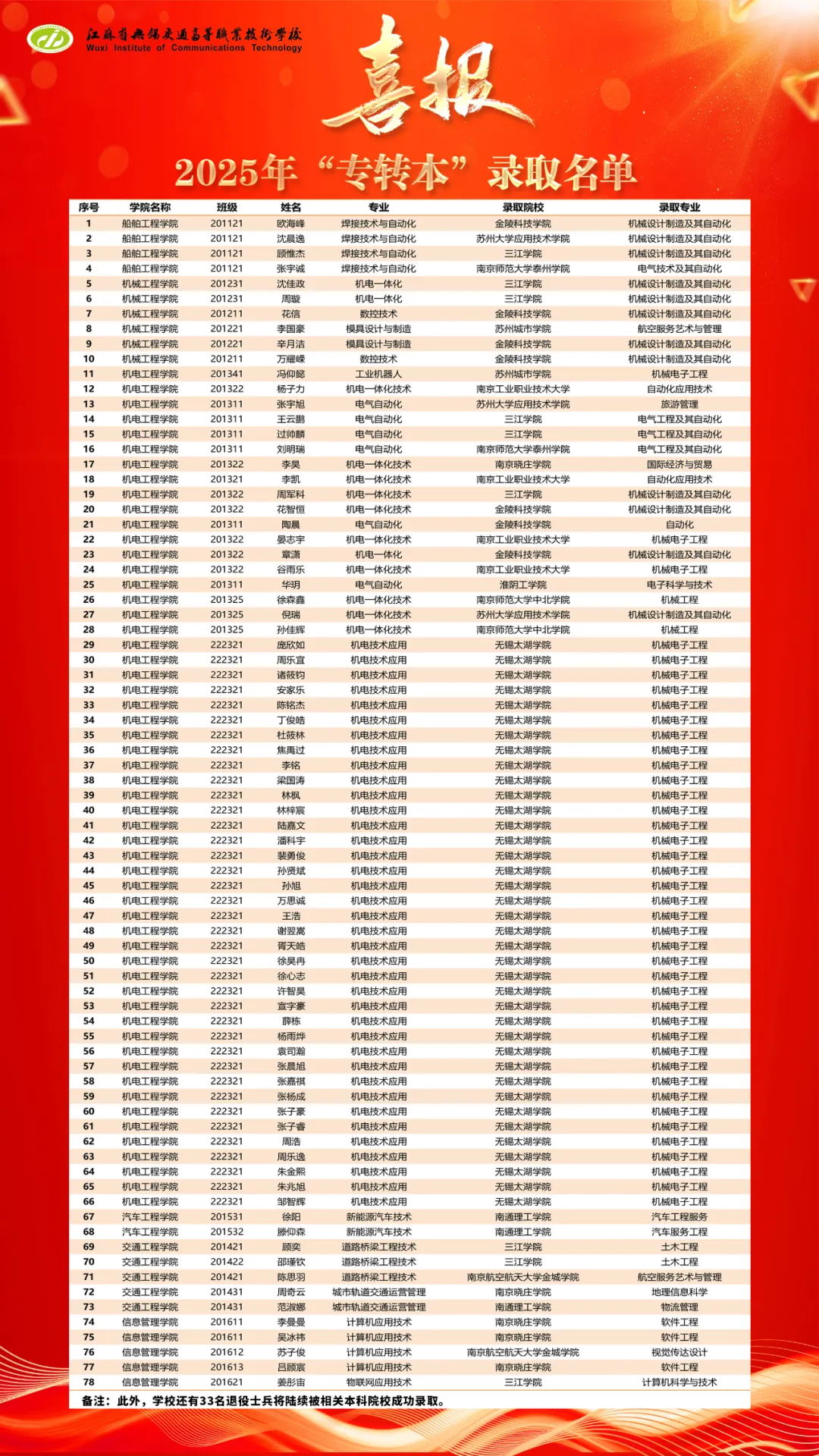 在2025年江苏省“专转本”选拔考试中,我校111名学子脱颖而出,成功被金陵科技学院、苏州大学应用技术学院、三江学院、无锡太湖学院等多所本科院校录取。此次不仅实现录取人数稳步增长,更在录取院校层次上取得重大突破,展现了学校卓越的人才培养成效。