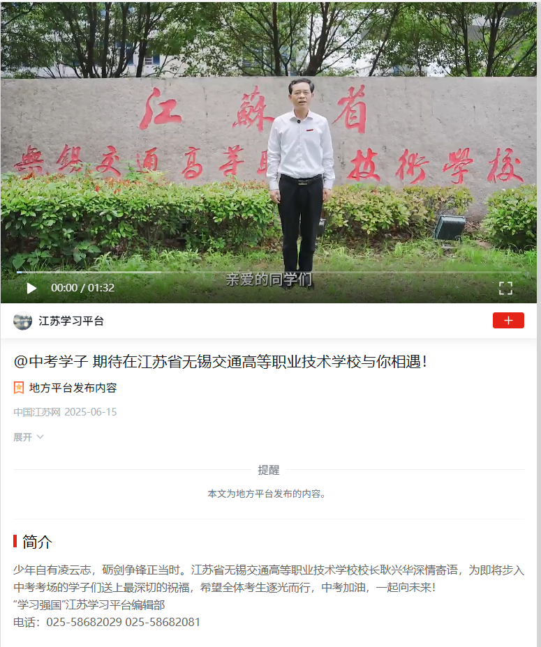 学习强国:@中考学子 期待在江苏省无锡交通高等职业技术学校与你相遇!