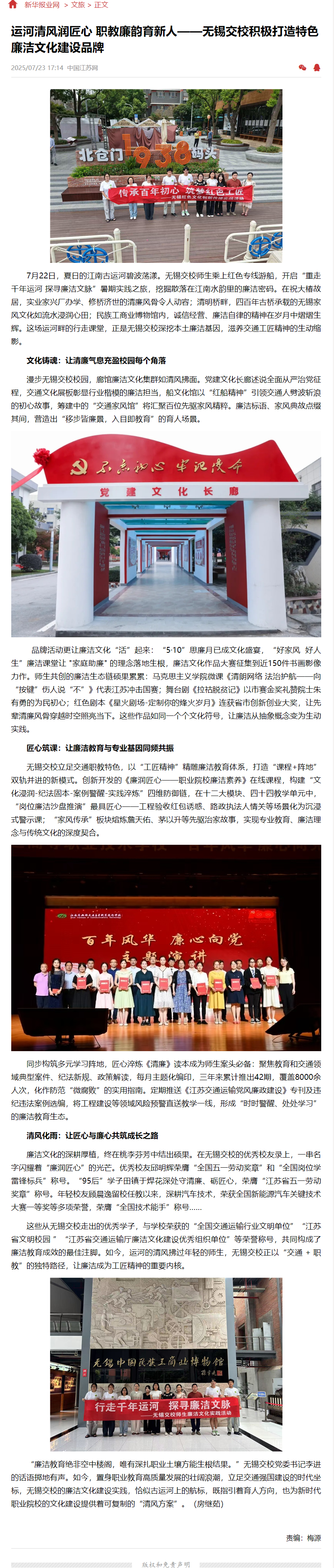 新华报业网:运河清风润匠心 职教廉韵育新人——无锡交校积极打造特色廉洁文化建设品牌
