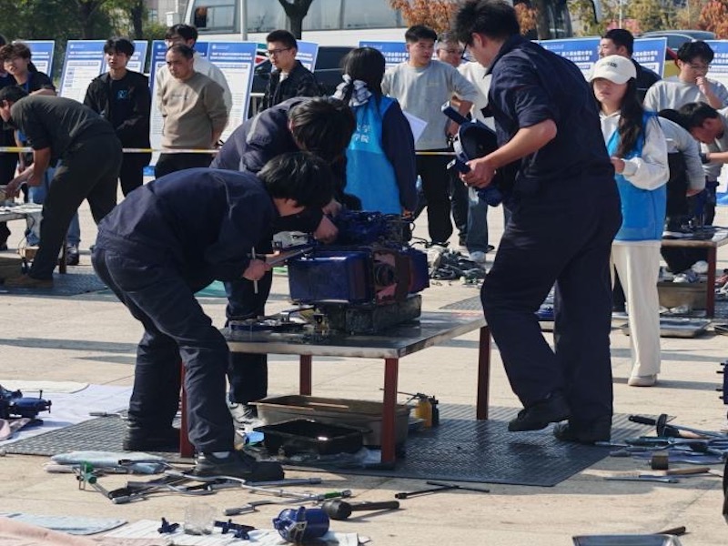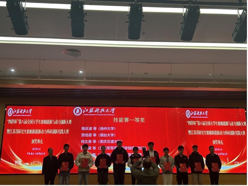 本次大赛主要包括创新作品制作赛、设计赛和技能赛三个赛项,共有来自30多所高等院校200多名参赛选手参加了本次比赛。我校船舶工程学院组织了两支队伍共6名学生参加了技能赛赛项。技能赛赛项主要内容是规范拆装CZ380船用柴油机,并要求选手能正确调试及启动设备。本次技能赛赛项中,共有32支队伍同场竞技。比赛现场,我校参赛选手严格按照比赛规程进行熟练操作,充分展现了积极向上的良好风貌、扎实的专业技能和良好的专业素养。最终,经过激烈的角逐,我校211141班梁奥、孙泽远和221131班陆楠同学组建的队伍,以及221131班杜栎涛、朱健和尹天源同学组建的队伍均获一等奖。