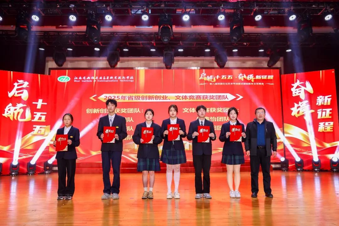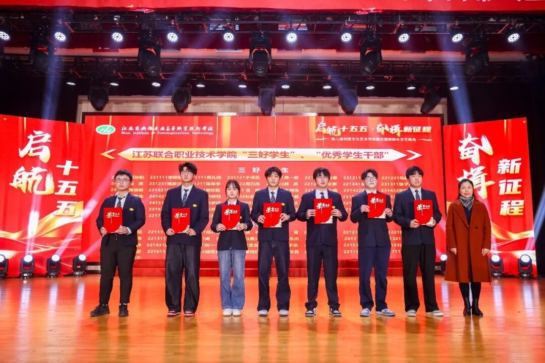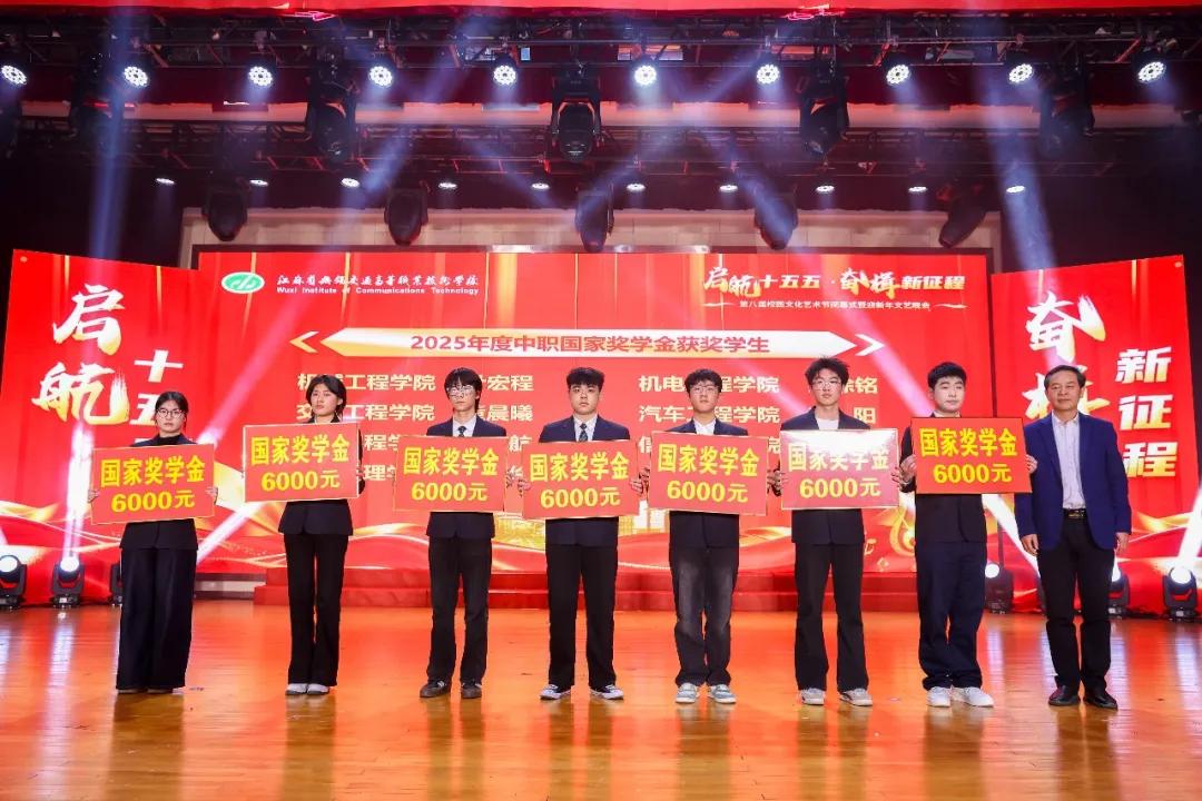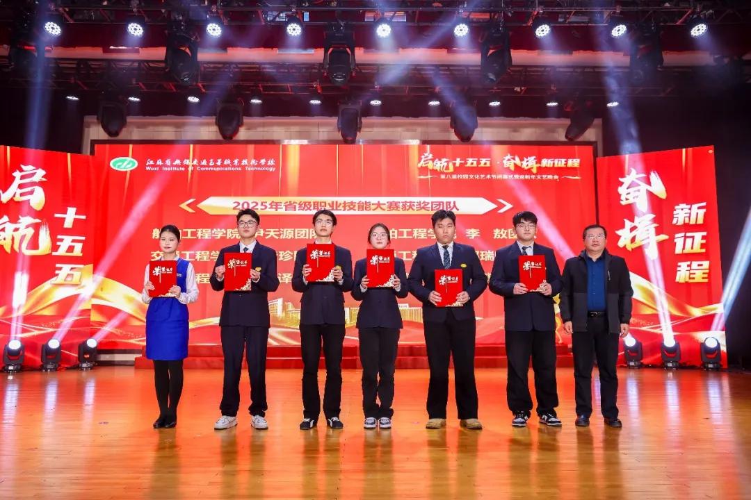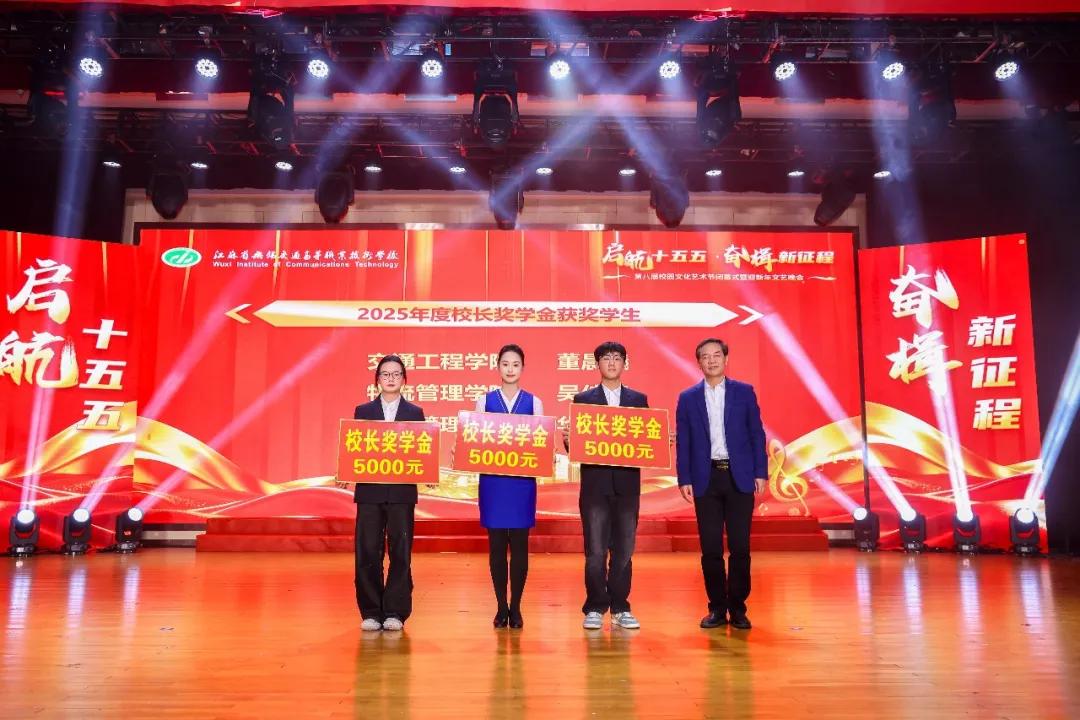 晚会首先举行颁奖仪式。校领导先后为2025年度在市级以上班主任能力大赛、省级以上创新创业大赛与职业技能竞赛、文体艺术赛事中荣获佳绩的师生代表,以及国家奖学金、校长奖学金、市级以上“三好学生”“优秀学生干部”获得者颁奖。一年来,学校坚持立德树人、以文化人,师生在各级各类平台屡获殊荣,展现了扎实的专业功底、出色的综合素养与昂扬的精神风貌。