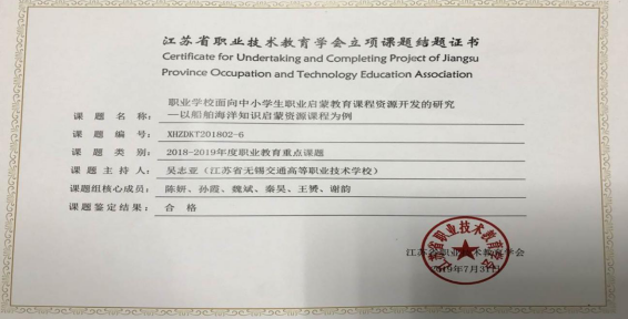 结业证书-职业学校面向中小学生职业启蒙教育船舶海洋知识课程资源开发的研究