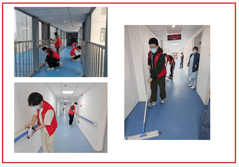 一部分同学前往病房帮患者推车、洗脚,聊天或协助家属推病患进出电梯,给予他们温暖和关怀;另一部分同学则在帮忙打扫环境卫生,让医护人员和患者拥有一个明亮干净的环境。