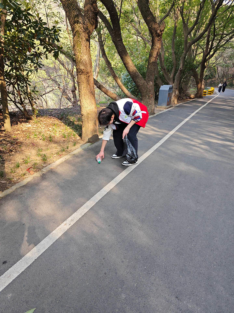 登山途中,同学们分成小组,手持环保垃圾袋和工具,沿途捡拾游客丢弃的塑料瓶、纸屑等垃圾。不少游客被学生们的行为所感染,纷纷为他们点赞,还有游客主动加入到捡垃圾的队伍中。抵达山顶后,同学各自拍照拍出了属于山顶的美丽城市的繁华景象并分享到班级群一起欣赏。下山后,同学们将收集的垃圾进行分类处理。