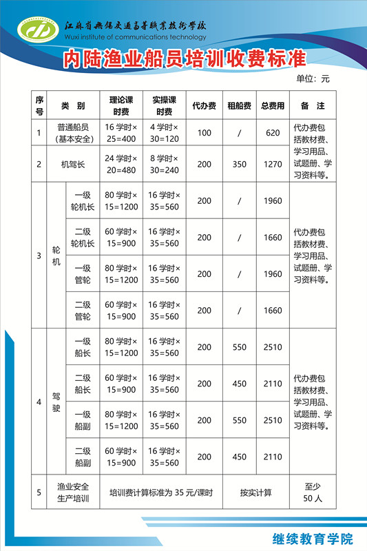江苏省无锡交通高等职业技术学校 内河船员培训收费标准