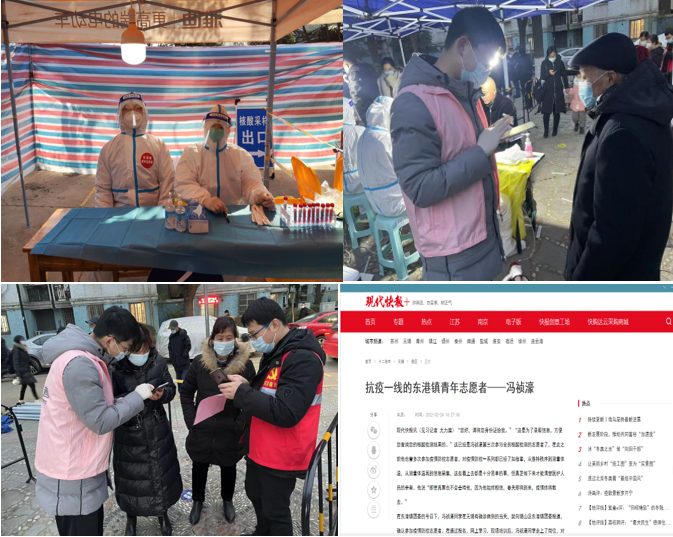 在三轮核酸采样中,他对各个岗位的工作都有了新的认识,也深刻的体会到了社区工作人员和医护人员的不易。当有居民没有携带身份证时,他会耐心的帮助他们用手机输入信息;当有年迈的老人进入核酸检测点后,他会细心的搀扶他们直至核酸采样结束。他说“即使再累也不会被击垮,因为我始终相信,春天即将到来,疫情终将散去。”疫情结束后,冯祯濠同学作为东港镇政府志愿者模范代表登上了现代快报版面。