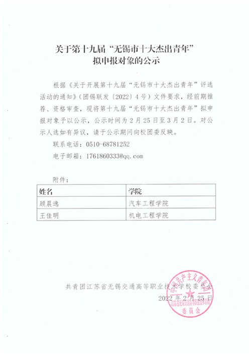 关于第十九届“无锡市十大杰出青年” 拟申报对象的公示