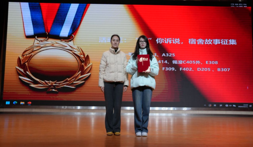 1211午,我校2024“宿舍文化节”评比颁奖仪式暨宿舍长培训讲座大礼堂举行。学生工作处副处长籍鑫慧,后勤管理处宿舍负责人,银城物业总经理,各学院学工领导参加颁奖仪式,并为获得奖项的寝室学生代表发奖状和奖品。