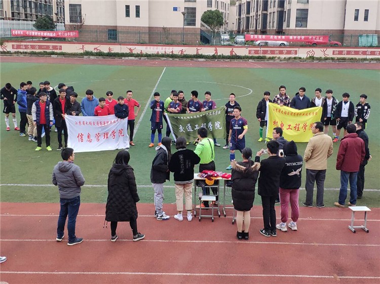在2018年12月5日的校足球赛的冠亚军争夺赛中,卫冕冠军交通工程学院足球队表现出色,战胜了老对手机电工程学院足球队,实现了校足球联赛的四连冠。赛后的颁奖仪式中,学工处副处长熊睿老师、机电工程学院党支部书记徐小国老师共同为本次比赛冠军颁发了奖牌和奖杯。