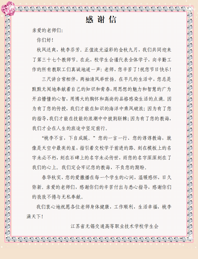 桃李不言,下自成蹊。教师的谆谆教诲,让学生们有了披荆斩棘、乘风破浪的勇气,校学生会代表全体学子发布一封感谢信,感谢老师的辛苦付出与悉心指导,感谢老师的孜孜不倦与无私奉献。