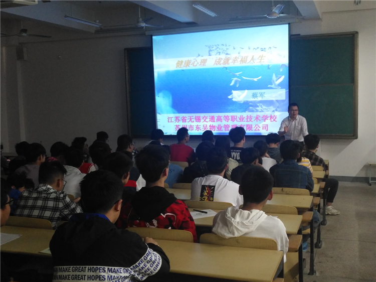 为提高同学对心理健康知识的认识,树立正确的心理健康观念,增强自我保护意识,养成自尊自爱的心理素质,学会积极健康地生活和学习,我校学生工作处和东吴物业有限公司2019418日下午举办了健康心理  成就幸福人生心理专题讲座,东吴物业经理、国家级心理咨询师蔡军应邀主讲。