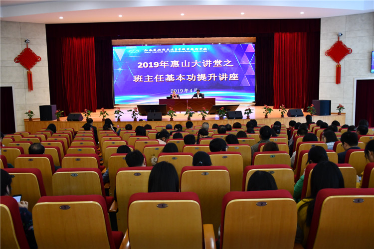 4月15日,学校邀请无锡城市职业技术学院副院长梅亚萍开展2019年惠山大讲堂之班主任基本功提升讲座。学工处、各学院学工负责人和全校班主任120余人参加了此次讲座活动。讲座由邢勇副校长主持。