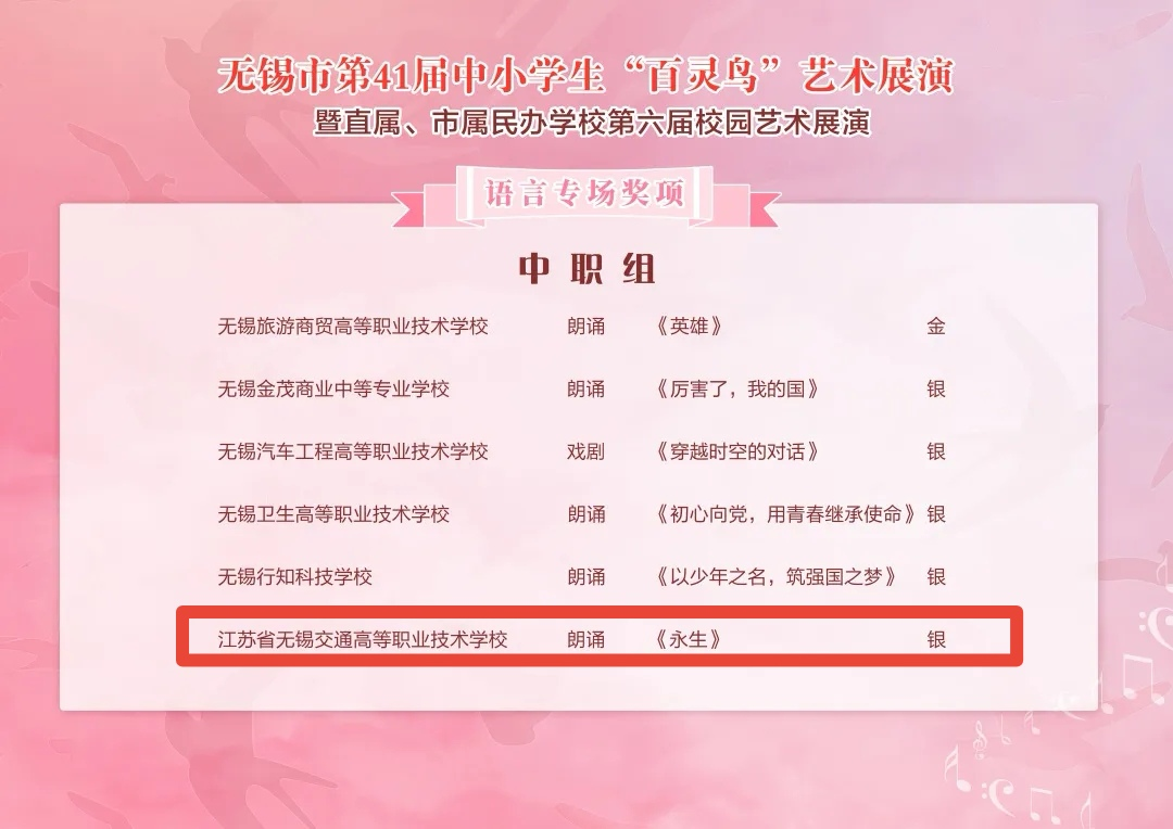 暑期,无锡市第41届中小学生“百灵鸟”艺术展演暨直属、市属民办学校第六届校园艺术展演在无锡市少年宫举行。经过激烈的角逐,我校的朗诵《永生》、舞蹈《傣韵》在全市各级各类学校选送的37个作品中脱颖而出,分别获得语言专场银奖和综合专场银奖。