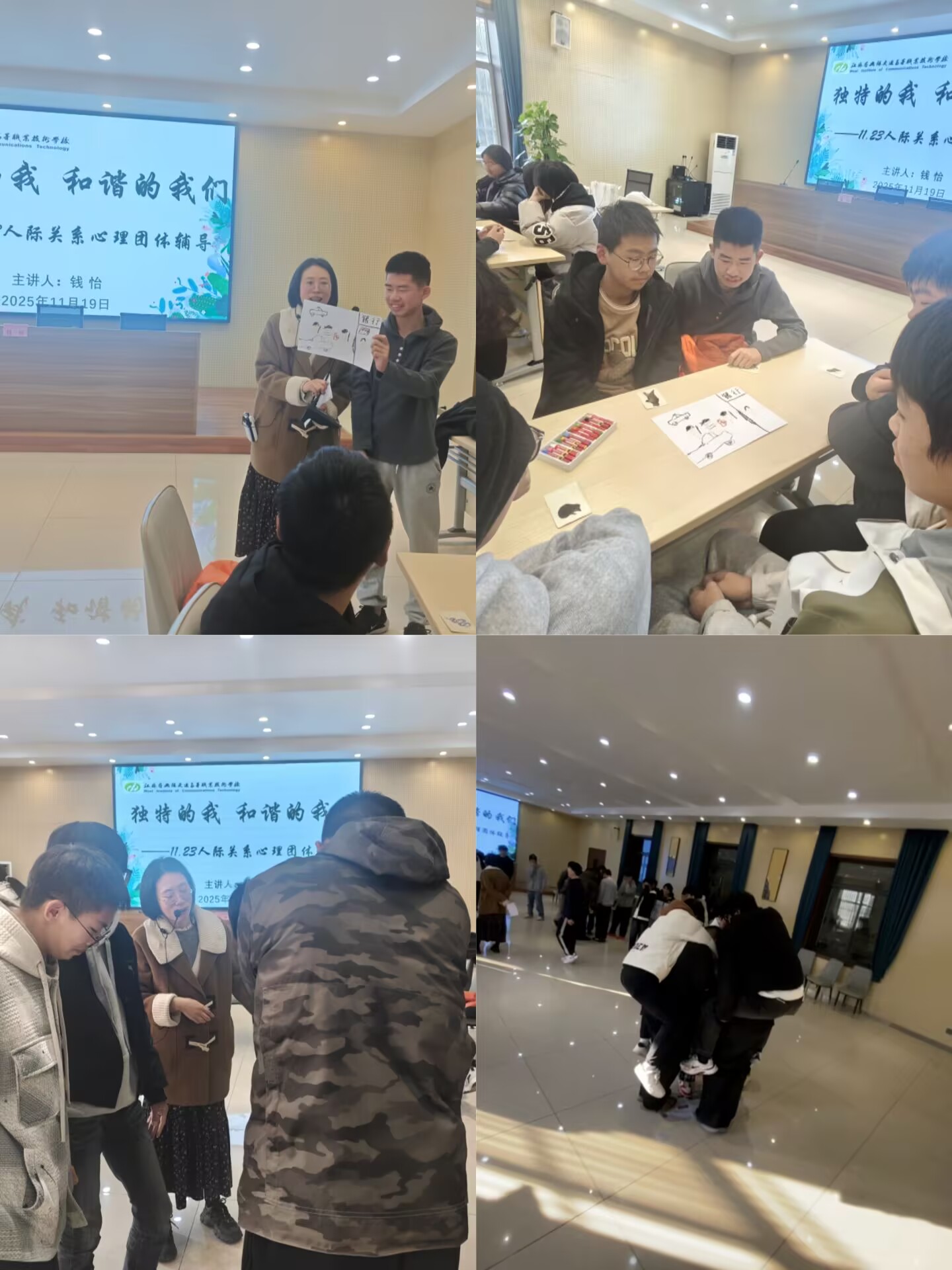 为引导同学们在集体中保持独特个性的同时尊重他人、协作共进,实现个人与集体的和谐统一,1119日下午,学校精心组织了“独特的我,和谐的我们”人际关系学生团辅活动。本次活动由无锡职业技术大学心理健康教育中心主任、副教授钱怡主持,40余名学生踊跃参与,在互动体验中收获成长。